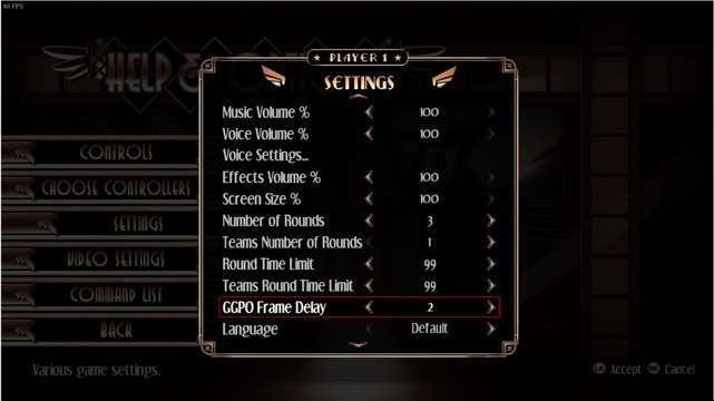 이 지연 프레임의 설정 가능 여부는 개발자의 재량에 달려 있습니다. 3rd Strike Online Edition, Darkstalkers Resurrection, Skullgirls 및 Samurai Shodown V Special과 같은 일부 게임에서는 사용자가 일반적으로 0에서 8프레임 사이의 지연을 설정할 수 있습니다. 킬러 인스팅트(Killer Instinct) 및 인저스티스 2(Injustice 2)와 같은 다른 게임은 보편적으로 모든 플레이어의 숫자(이 게임의 경우 3프레임)를 선택하고 변경할 수 있는 옵션을 제공하지 않습니다.