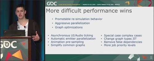 이 모든 것은 하나의 게임 프레임에서 수행되어야 하기 때문에 일반적인 게임 루프 조작과 더불어 일반적으로 최적화가 또 다른 주요 관심사입니다. 고급 파티클 시스템이나 패브릭 시뮬레이션에서 사용하는 고가의 CPU 사이클로 인해 게임의 성능 범위가 초과될 수 있습니다. 어쩌면 초기에 게임을 빌드할 때에는 극효율적이어야 할 필요성이 없었기 때문에 콘솔의 성능에 대해 대수롭지 않게 여겼을 수도 있습니다. Stallone에 따르면 기존 지연 기반 넷코드 솔루션에서 PS4 및 Xbox One의 추가 마력으로 인해 전체 프레임을 실행하는 데 16ms 예산 중 평균 10ms만 사용했다고 말합니다. 이후 최적화되지 않은 나이브한 롤백 솔루션으로 갓 전환했을 때에는 프레임 실행 비용이 32ms로 3배 이상 증가했고, 이로 인해 팀은 게임 내 시스템을 거의 모두 재평가하여 성능 향상을 모색해야 했다고 그는 말합니다.