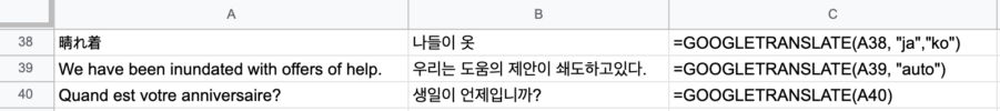 구글 스프레드시트에서는 잘 알려지지 않은 함수가 하나 있습니다. GOOGLETRANSLATE 라는 함수를 사용하면 구글 번역기를 이용하여 특정 셀에 있는 문장이나 단어를 자동으로 번역합니다. 다량의 외국어 데이터에 대한 초벌 번역이나 단어장 만들기용으로 활용도가 높습니다.