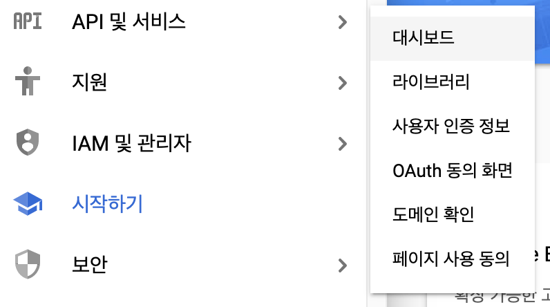 5. 왼쪽 [API 및 서비스] 메뉴의 [대시보드] 를 클릭합니다.