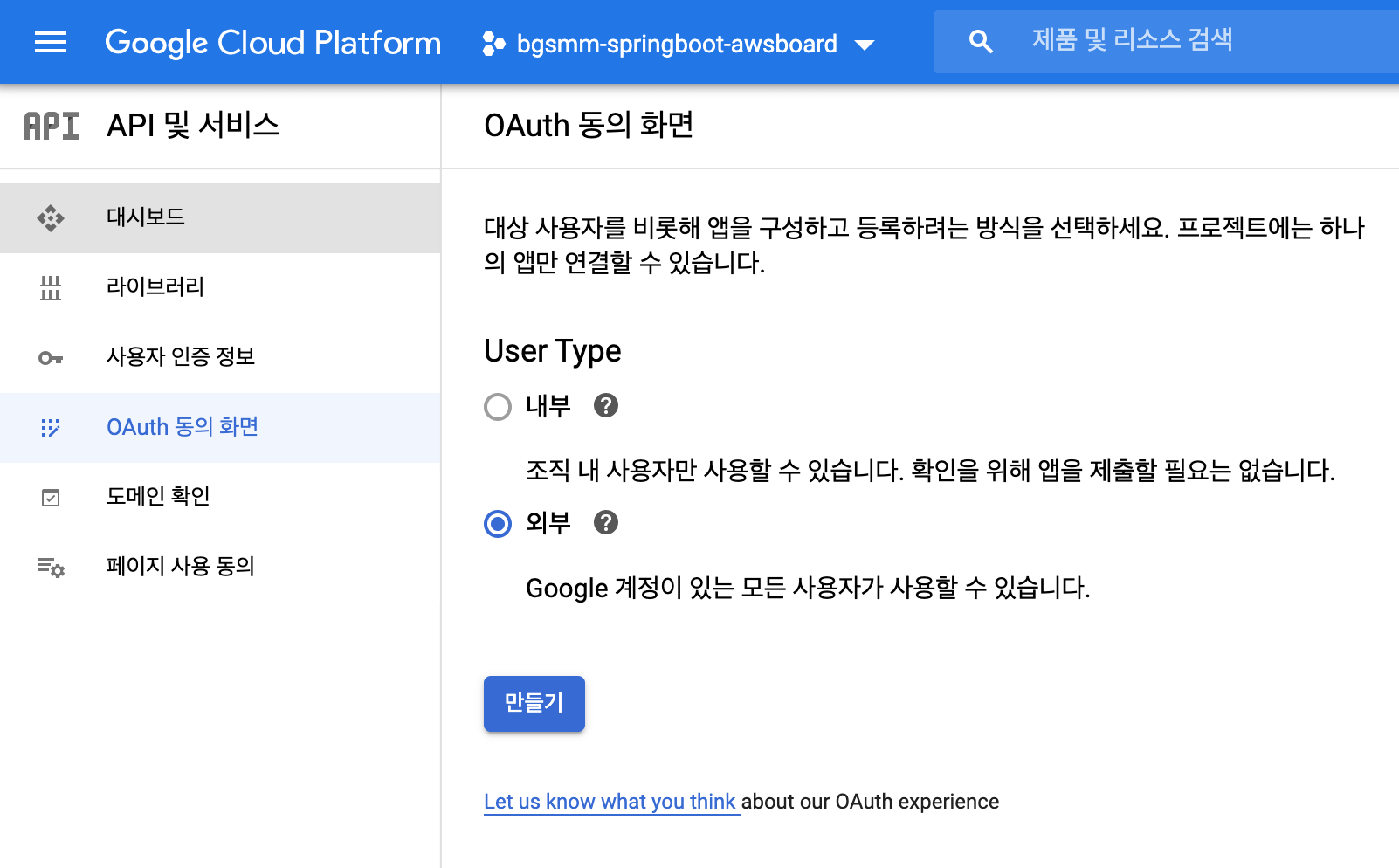 4. 프로젝트 이름을 입력하고 [만들기] 버튼을 클릭합니다.