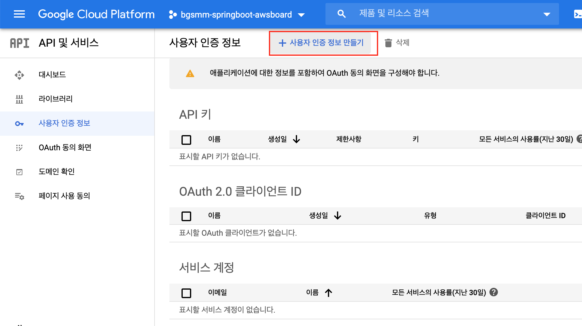 8. 상단의 [사용자 인증 정보 만들기] 를 클릭합니다.
