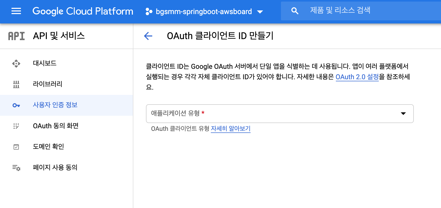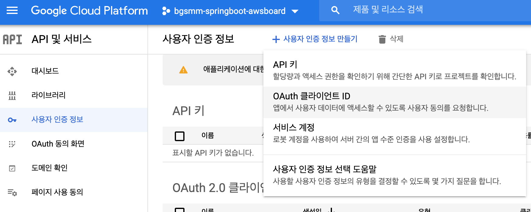 11. 다시 OAuth 클라이언트 ID 만들기에 접속합니다. 애플리케이션 유형은 웹 서비스, iOS, Android 등이 있습니다.