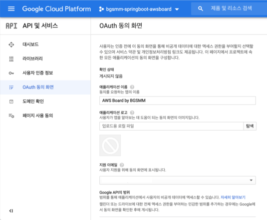 10. OAuth 동의 화면을 만들지 않았다면 동의 화면을 만드는 페이지로 이동됩니다. 여기서 [애플리케이션 이름], [지원 이메일] 만 입력하고 [저장] 버튼을 클릭합니다.