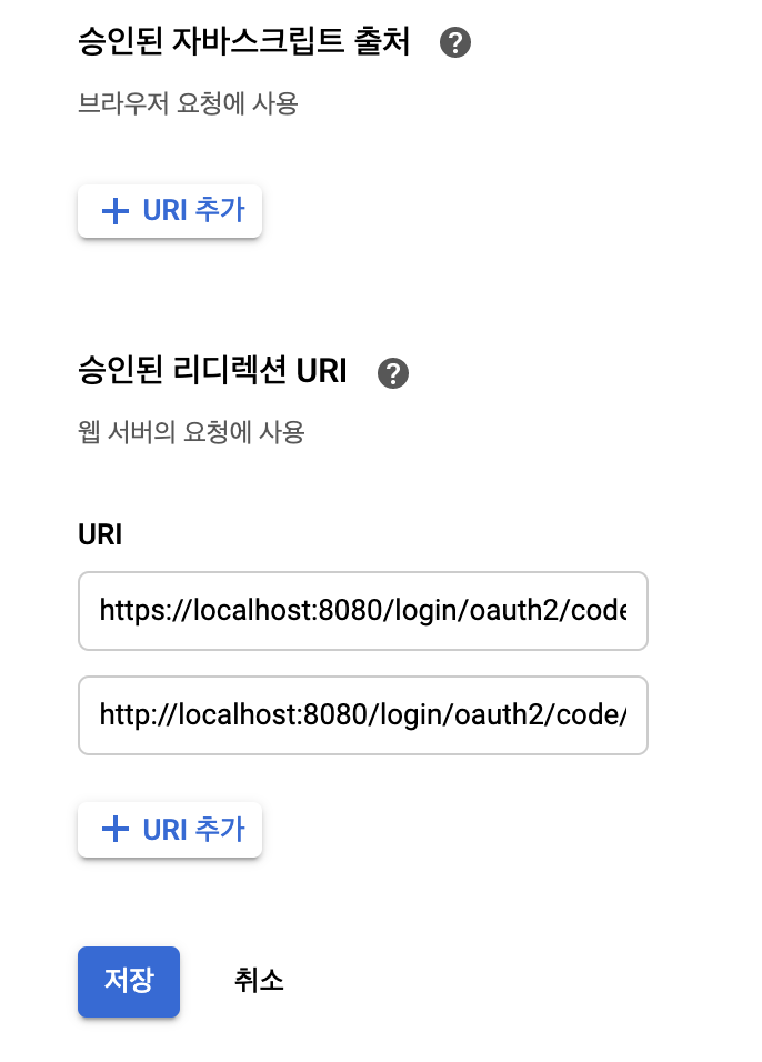 12. 승인된 리디렉션 URI를 추가합니다. 이 부분은 구글 로그인을 사용하는 애플리케이션이나 프레임워크에 따라 다릅니다.
