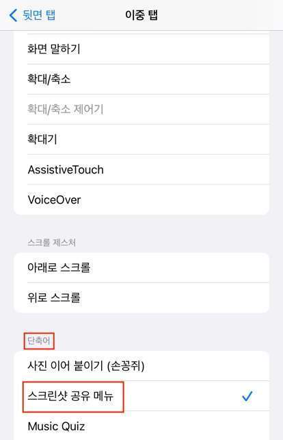 단축어 그룹을 찾은 뒤 방금 전에 설치한 스크린샷 공유 메뉴 단축어를 선택합니다.