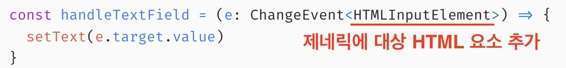 ChangeEvent가 사용되며, 제네릭 부분에 이벤트가 발생하는 HTML 요소의 타입(HTML element interfaces)을 지정합니다.- 예를 들어