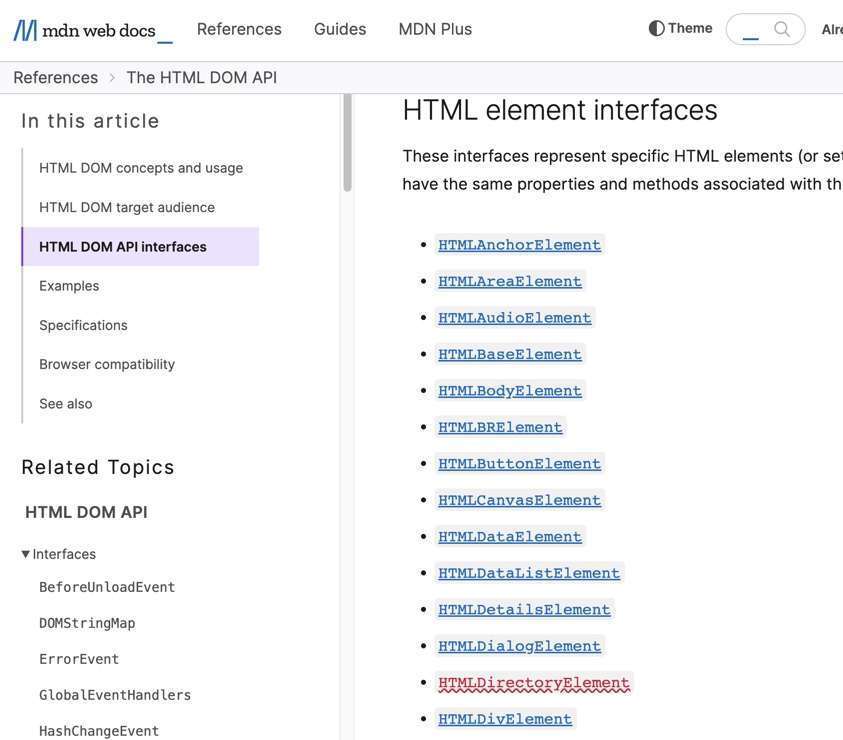 HTML element interfaces의 목록은 MDN web docs - The HTML DOM API 링크를 참조하면 됩니다.