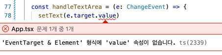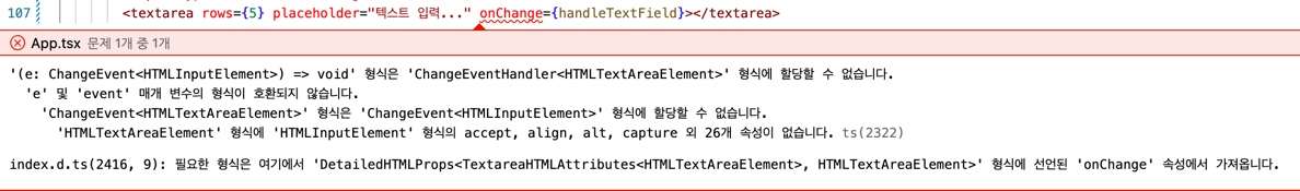 자바스크립트에서는 타입을 지정할 필요가 없으므로 하나의 함수를 공유해서 쓰면 되지만 타입스크립트에서는 타입을 구분해야 하기 때문에 공유할 수 없습니다. 예를 들어 handleInputText를 텍스트 구역에 적용하려고 하면 아래와 같은 오류가 발생합니다. 둘의 파라미터 타입은 ChangeEvent로 동일합니다만, 제네릭은 HTMLInputElement로 지정되어 있으나 실제 <textarea>는 HTMLTextAreaElement 이기 때문에 타입이 맞지 않아 오류가 발생하는 것입니다.