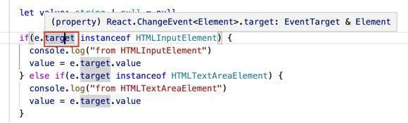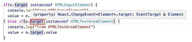 <input>인지<textarea>인지 구분하여 실행합니다. instanceof가true인 경우 해당 실행 블록에서는e.target의 타입이 자동으로 확정되므로as등으로 타입을 재지정하지 않아도 됩니다. (아래 스크린샷 참조)
