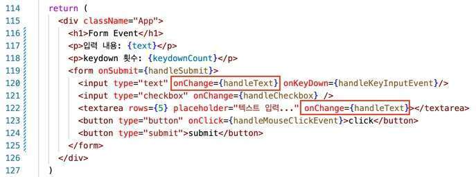 위의 Hook 예제를 보면 인풋 필드 <input>과 텍스트 구역 <textarea>의 onChange가 똑같이 setText(e.target.value) 를 실행하고 있습니다. 그러나 이를 실행할 콜백 함수는 handleTextField와 handleTextArea로 나뉘어져 있습니다.