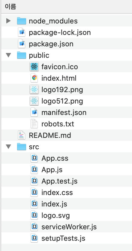 index.js는 Vue의main.js에 해당하는 역할을 합니다.App.js는 Vue의App.vue역할을 합니다.- 각각의