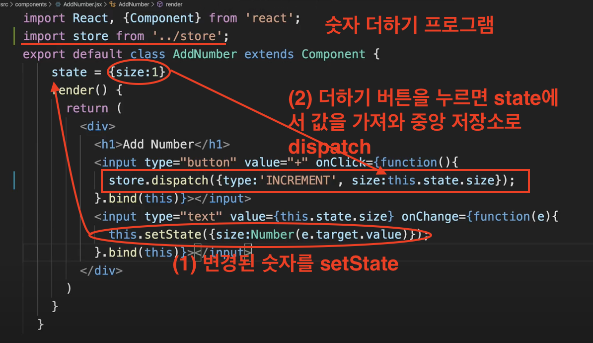 dispatch란 하위 컴포넌트에서 중앙 저장소에 저장된 값을 변경할 때 사용하는 명령어를 뜻합니다. dispatch(객체)는connect함수 내부에 정의되어 있기 때문에 별도의store를 임포트할 필요가 없습니다. 객체에는 일반적으로type이 정의되어야 하며 이 타입을 바탕으로store.js에서 취할 액션을 찾은 다음(action.type) 나머지 변수들을action.***을 처리하는 방식으로 진행합니다.- 이 코드에서는