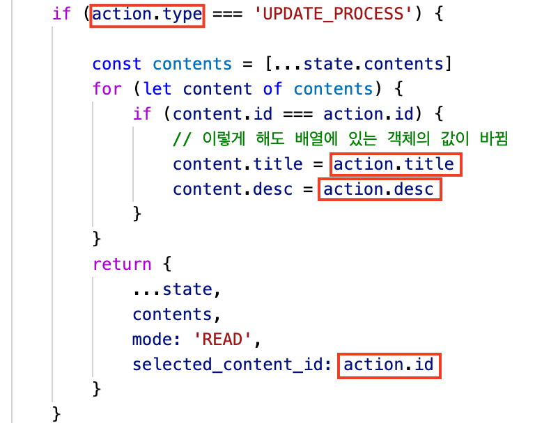 store.dispatch({...})이런식으로 값을 변경하라는 지시를 하게 됩니다. 여기서dispatch함수의 파라미터가action으로 넘어가게 됩니다.store.dispatch({type: 'UPDATE_PROCESS', id, title, desc})외부 컴포넌트에 위와 같은 코드가 있다면 이것이 실행될 때에는store.js의reducer함수에서action.type,action.id,action.title,action.desc로 넘어가 처리합니다.