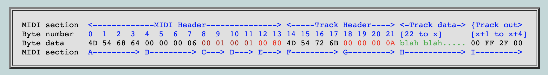 빨간색(및 녹색)으로 강조된 부분은 편집하려는 부분입니다. 많은 플레이어가 트랙의 나머지 부분에서 정확한 바이트 수를 명시해야 하므로 섹션 G에 특히 주의하세요! ”blah blah…..”는 실제 음악 데이터가 들어가는 곳입니다. (H & I)