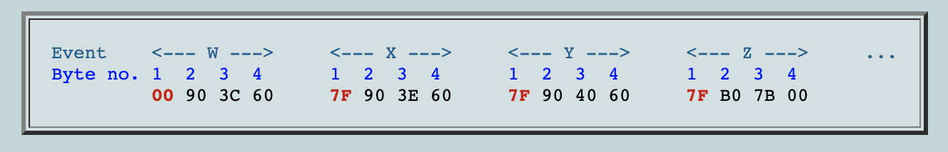 여기에서 각각 4바이트(각 바이트는 2개의 ‘nibble’ - 2개의 16진수 숫자로 구성됨)를 포함하고 각각 바이트 1(빨간색)의 타임스탬프로 시작하는 4개의 이벤트를 볼 수 있습니다. 이벤트는 여러 가지가 될 수 있습니다. 음을 연주하거나 중지하라는 메시지가 될 수도 있고, 비브라토를 추가하거나 악기를 변경하라는 메시지가 될 수도 있습니다. 하지만 모든 이벤트는 타임스탬프로 시작됩니다. 표시된 예에서 처음 세 이벤트(W, X, Y)는 각각 중간 C, D, E의 음표를 연주합니다. 네 번째 이벤트인 Z는 모든 음표를 무음 처리합니다. 이제 다음은 다양한 바이트 번호에 대한 요약입니다.