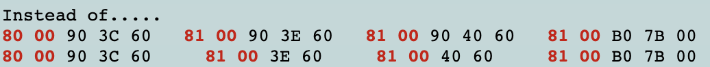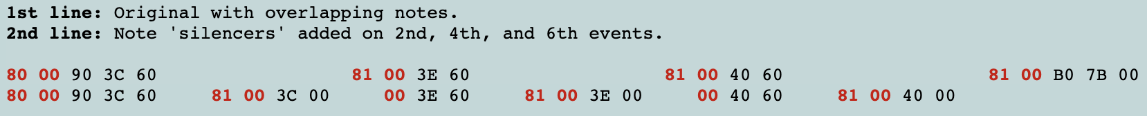 두 번째 줄에서 볼 수 있듯이 각 소음기 이벤트(2번째, 4번째, 6번째 이벤트)는 81 00의 딜레이를 가졌기 때문에 이후에 울리는 음(3번째 및 5번째 이벤트)에 대한 타임스탬프는 00이어야 합니다. ‘대기(wait)’가 이미 이전 이벤트에 의해 수행되었기 때문입니다. 또한 모든 메모가 이미 중지되었으므로 마지막 이벤트(All notes off)가 2라인의 예제에서 삭제되었습니다! 마지막으로, 두 라인의 모든 이벤트는 앞에서 설명한 ‘실행 상태’ 트릭으로 인해 암시적인 상태 90을 가집니다.