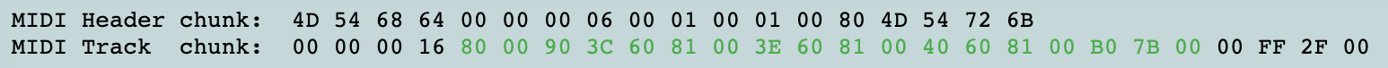 실제로 실제 MIDI 파일을 생성하고 있음을 증명하기 위해 위의 데이터를 사용하여 페이지 상단 근처에 있는 원본 템플릿의 섹션 H에 삽입하겠습니다! (G 섹션에서 바이트 21을 편집해야 함). 이 코드를 복사하여 자주 사용하는 16진수 에디터에 붙여넣고 MIDI 파일로 저장하여 작동하는지 확인할 수 있습니다.