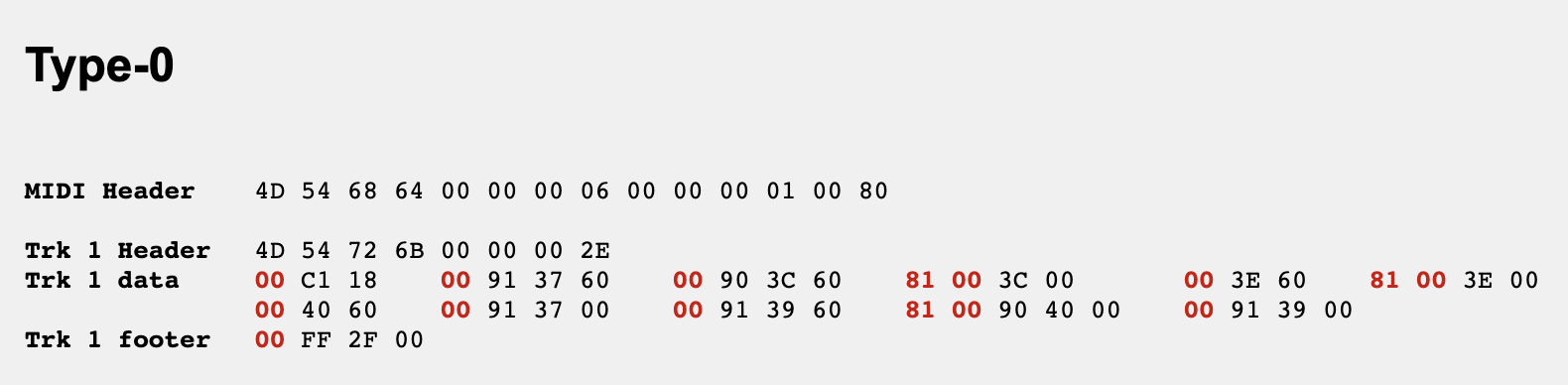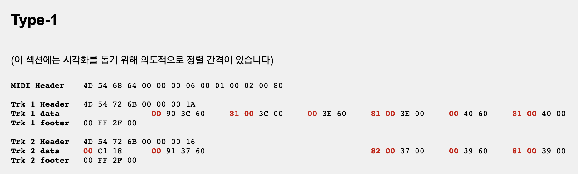 먼저 Type-1 버전이 어떻게 생겼는지 보여줍니다. C, D, E는 트랙 1로, G와 A는 트랙 2로 이동합니다. 기본적으로 트랙 2는 트랙 1이 재생되는 동안 재생되므로 서로 효과적으로 중첩됩니다. 또한 트랙 헤더와 ‘푸터’, 전체 MIDI 파일을 완성하기 위한 MIDI 헤더가 포함됩니다. 시각화하기 쉽도록 데이터를 정렬했습니다. (실제 파일에서 바이트는 모두 바로 옆에 있습니다).