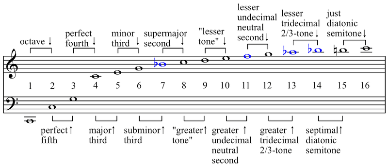 장 17도보다 큰 음정은 거의 나오지 않으며, 예를 들어 19도가 아닌 2옥타브 + 5도 와 같은 겹음정적 이름으로 언급됩니다.