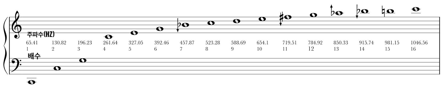 처음 몇 개의 배음들이 이미 메이저 코드를 나타내는 것을 볼 수 있습니다. 따라서 순서를 계속 진행함에 따라 배음은 점점 더 가까워지고, 가장 높은 음은 매우 조용하고 훨씬 더 반음계적(more chromatic)으로 됩니다.
