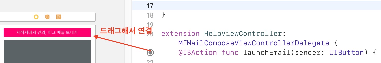 위의 @IBAction func launchEmail 를 스토리보드의 버튼과 연결합니다.