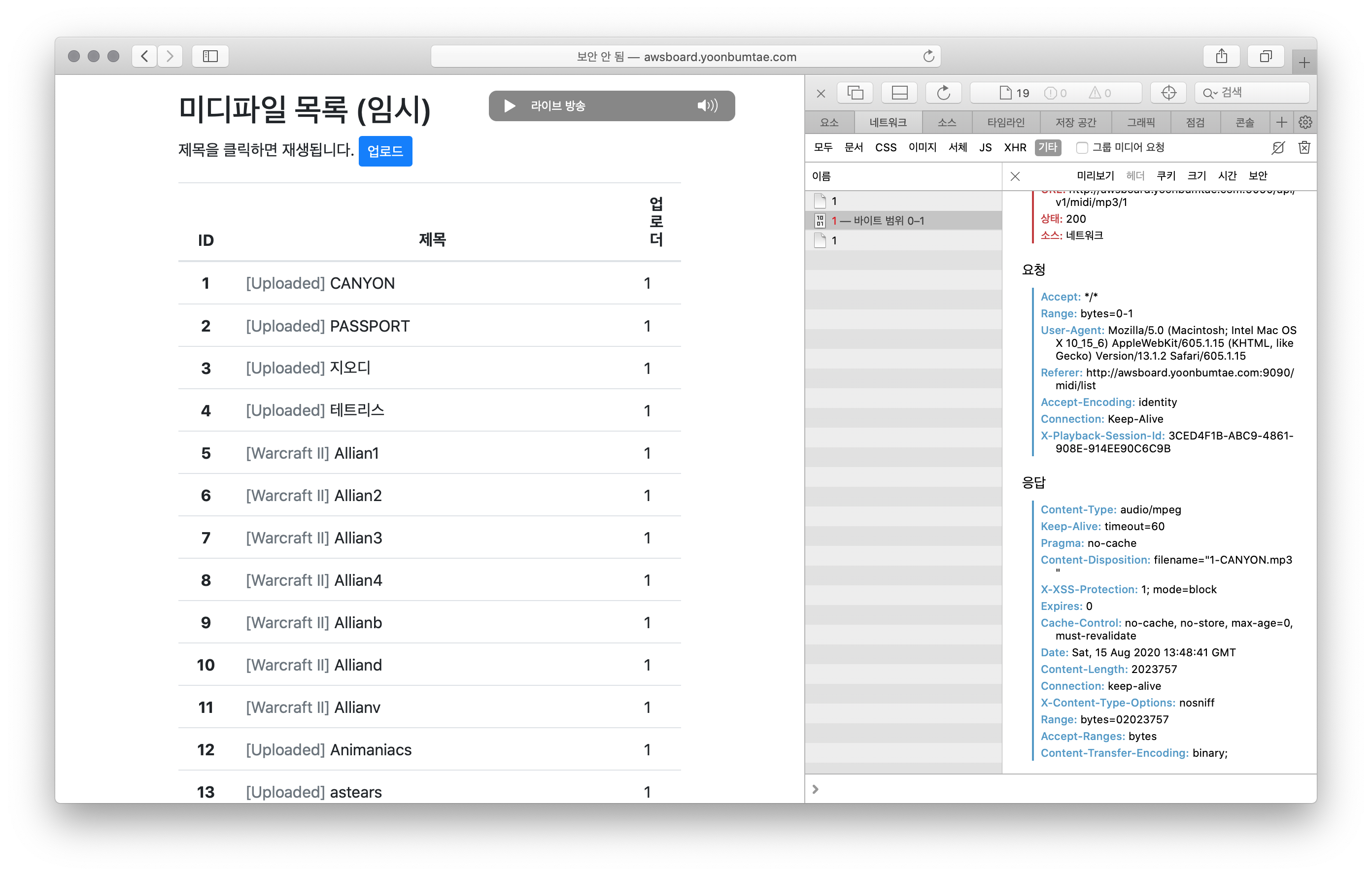 위는 사파리 스샷입니다. MP3 파일을 소스에 배정했는데 “라이브 방송(live broadcast)“이라면서 재생만 되고 일시정지조차 제대로 되지 않는 문제가 있었습니다. 게다가 파일도 끝부분을 제대로 읽어들이지 못하고 있었습니다.