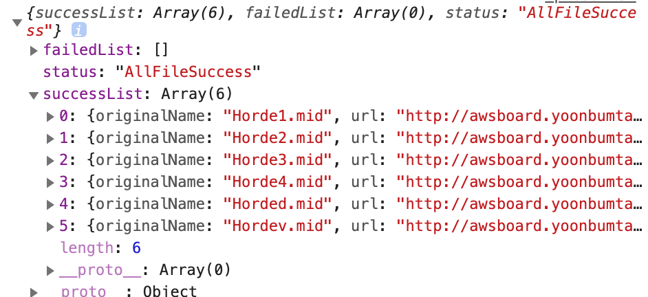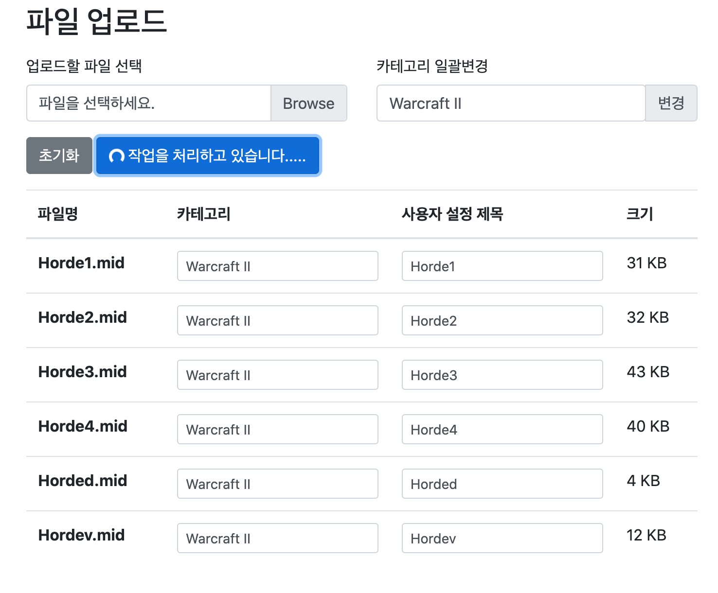 업로드에서 미디 파일을 여러 개 선택하면 위 그림처럼 리스트가 뜹니다. 워크래프트 2 배경음악 파일이라서 카테고리를 “Warcraft II” 로 일괄 변경하였습니다. 업로드 버튼을 누르면 버튼에 로딩 이미지가 추가됩니다. 업로드가 완료되면 결과창이 나옵니다.