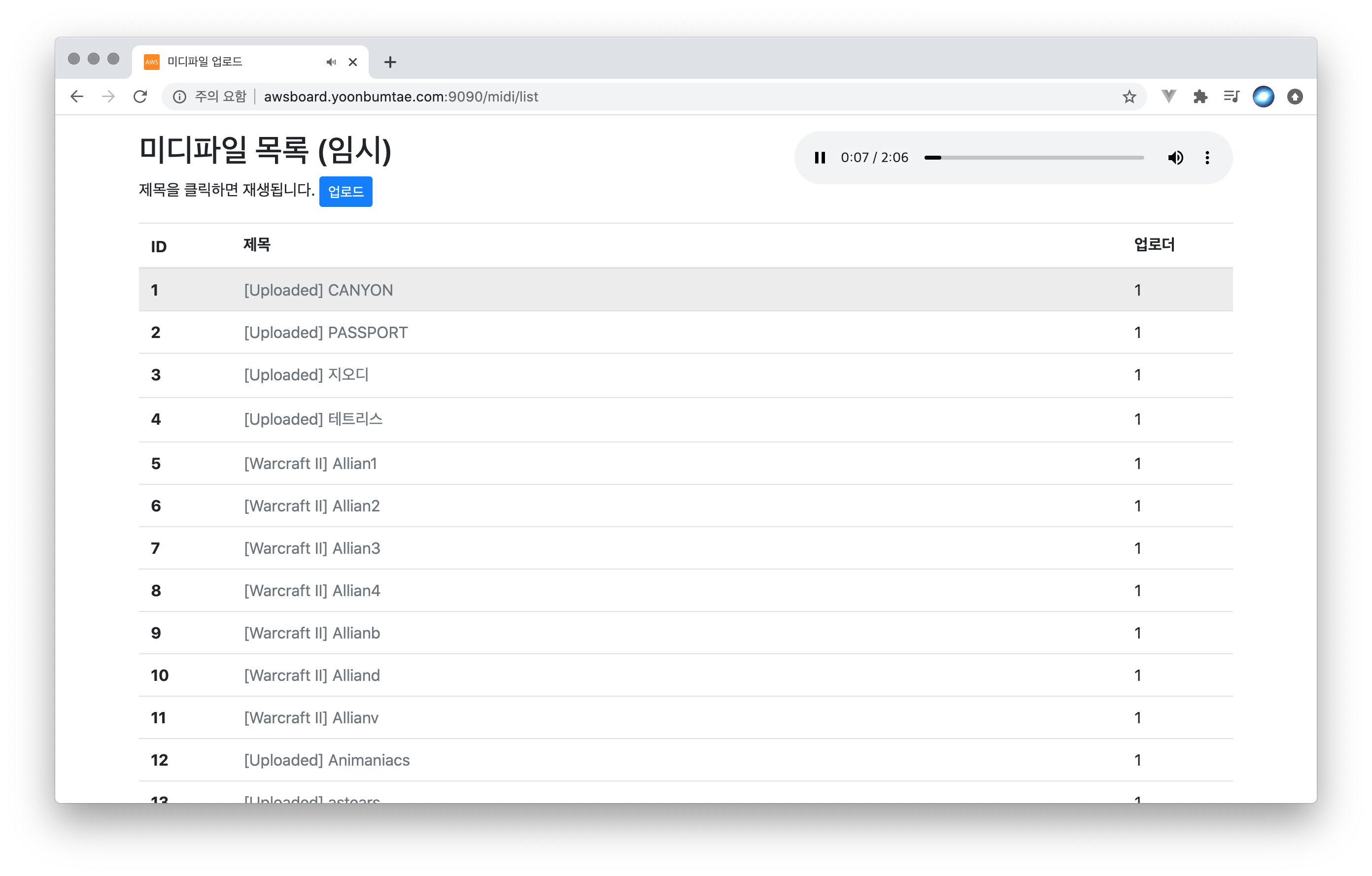 일단 ‘재생 기능만 구현’이라는 목적 하에 만들었습니다. 제목을 클릭하면 업로드된 노래가 재생이 됩니다.