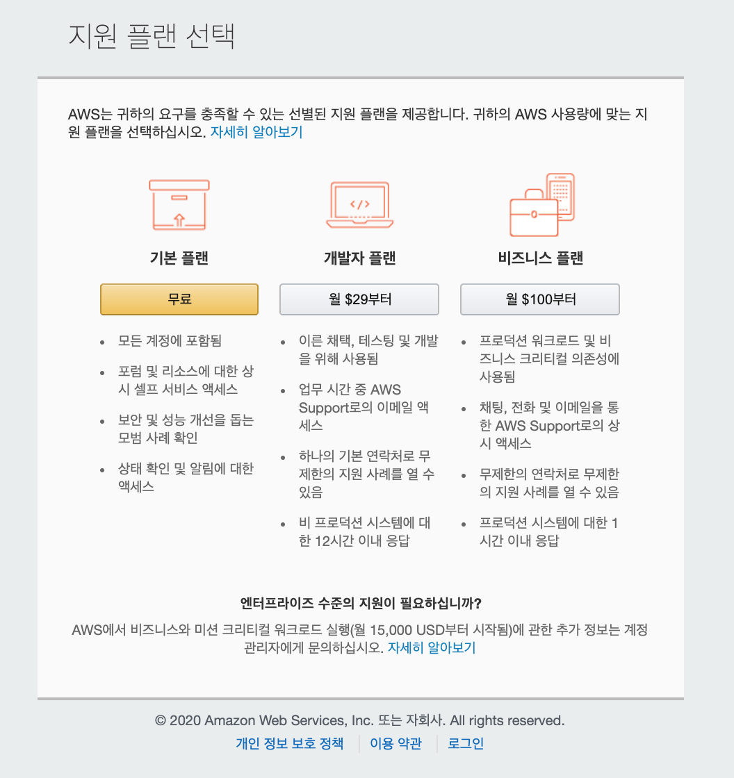 5) 지원 플랜 선택에서 기본 플랜(무료) 선택