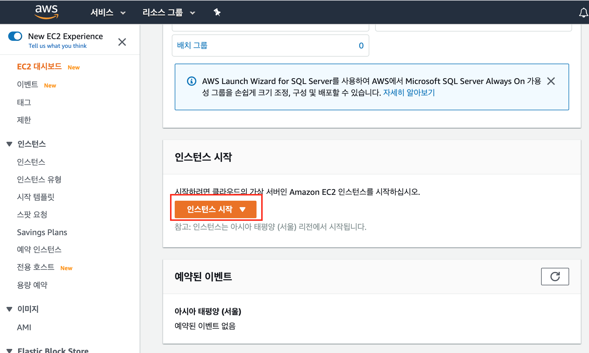 7) AWS EC2 대시보드에 접속한 뒤 [인스턴스 시작] 버튼 클릭