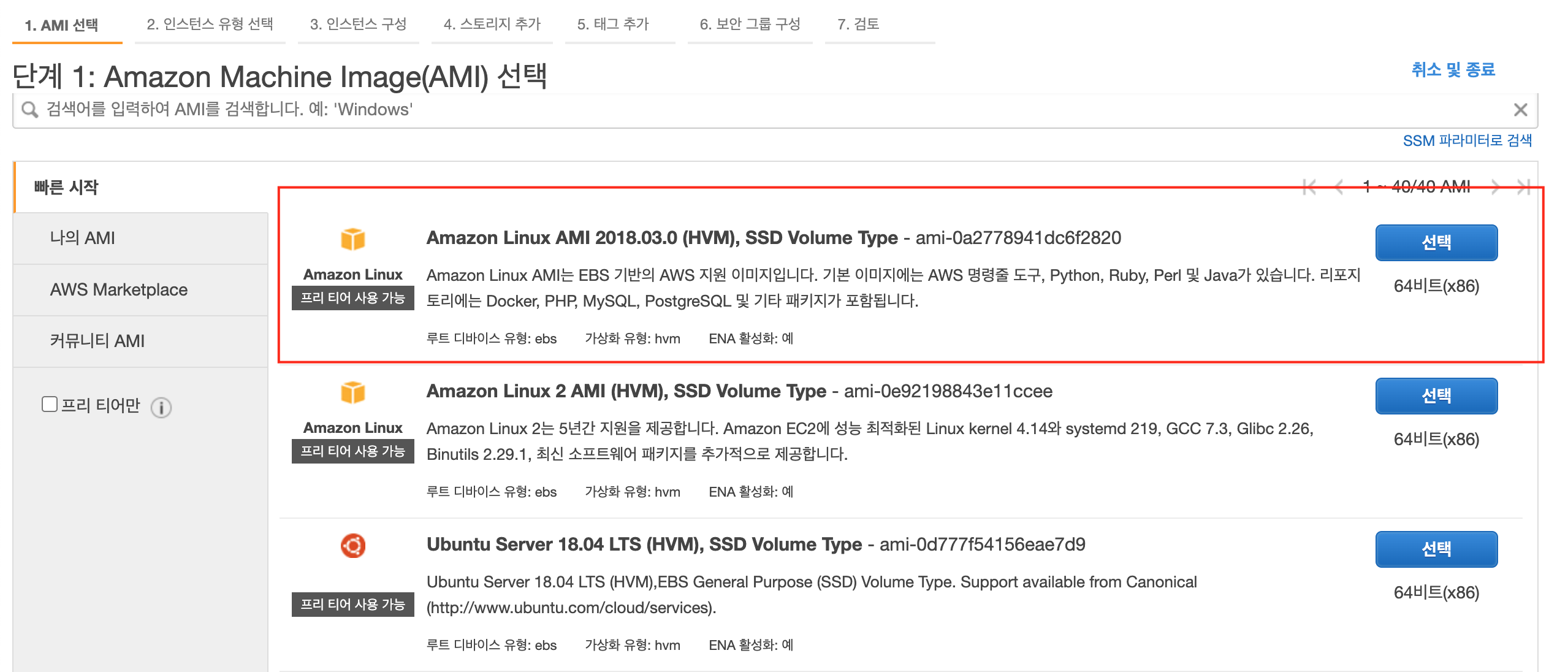 8) Amazon Linux AMI 2018.03.0 (HVM), SSD Volume Type 선택