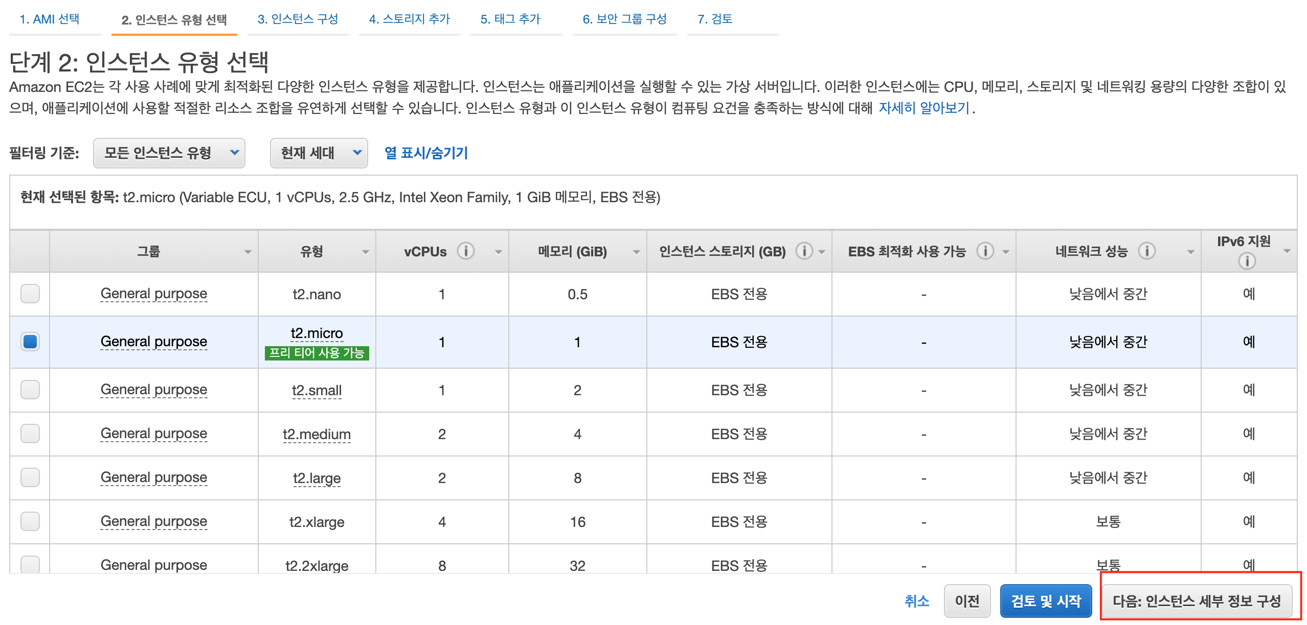 9) 프리 티어 사용 가능한 인스턴스 선택