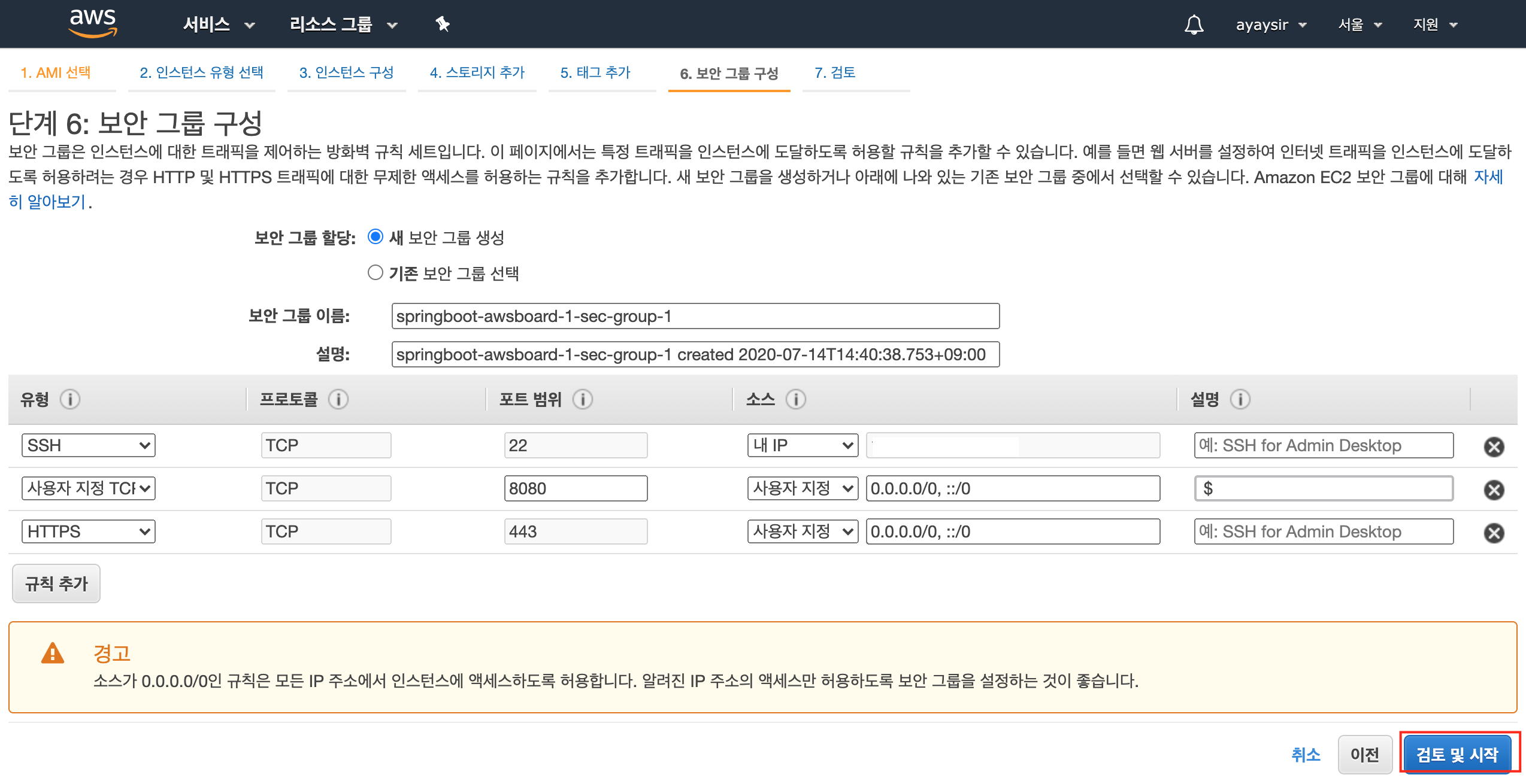 12) 보안 그룹에서 유형 SSH는 소스를 [내 IP]로 선택해 외부 접속을 하지 못하도록 설정