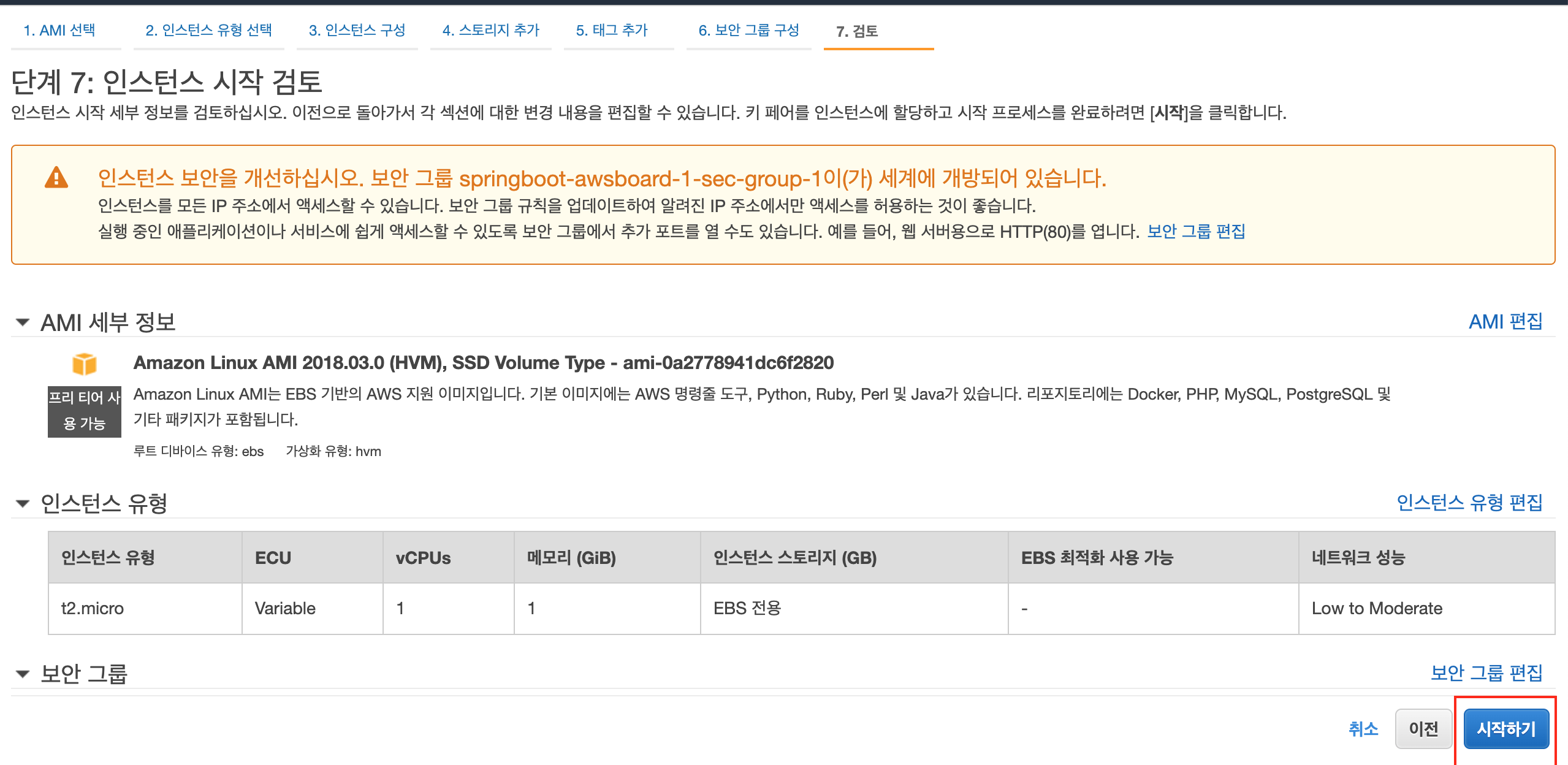 13) 인스턴스 시작 검토 페이지를 확인한 후 [시작하기] 버튼 클릭