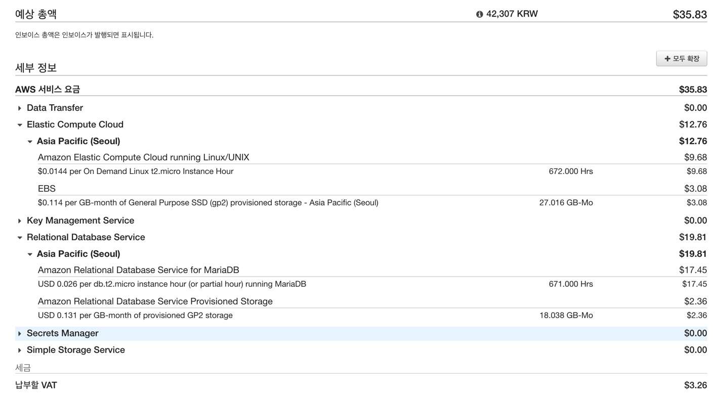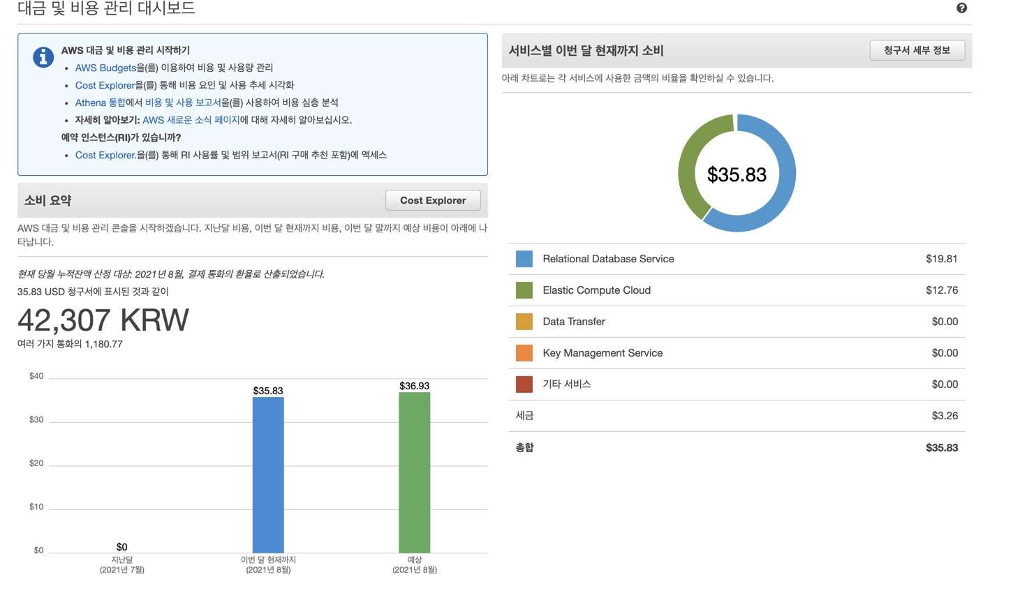 AWS 프리티어 만료 후 금액은 한 달에 약 4만원대로 개인이 단순히 AWS 학습 용도로 운영하기엔 상당히 부담이 되는 금액임을 알 수 있습니다.