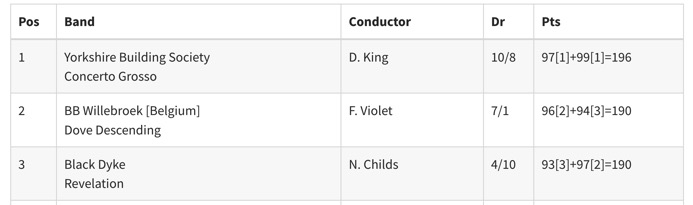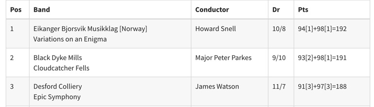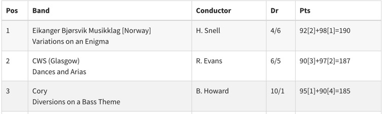 많은 사람들이 오랫동안 생각했던 것을 마침내 입증한 승리였습니다. 유럽 밴드들이 밴드 대회에서 영국 밴드들만큼, 어쩌면 더 뛰어날 수도 있다는 사실을 말이죠. 노르웨이의 에이캉거 브라스 밴드(Eikanger-Bjørsvik)는 이전에도 챔피언십에 참가했지만, 전성기에 있던 스넬(Howard Snell)과 블랙 다이크(Black Dyke)를 앞지른 두 번의 공연(자유 선택곡 부문에서는 공동 1위였지만, 정해진 곡 부문에서는 앞섰습니다.)을 통해 그들이 유럽 최고의 밴드 중 하나임을 증명했습니다. 그들은 단 1점 차로 우승했지만(지정곡 “코노테이션스(Connotations; 함의, 내포라는 뜻)”에서도 1위를 차지), 이 1점은 큰 의미가 있었습니다. 유럽 챔피언십은 다시는 이전과 같지 않을 것이었고, 대회는 마침내 성숙해졌습니다. 그들은 1년 후 3점 차로 타이틀을 방어하며 이것이 단발성 승리가 아님을 입증했으면서도, 이 순간은 대회의 결정적인 순간이었습니다.