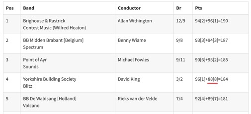 YBS(요크셔 빌딩 소사이어티, Yorkshire Building Society)와 데이비드 킹(David King)은 대회 역사상 두 번째로 세 번 연속 우승을 할 수 있는 기회에 있었습니다. 그들은 이미 세트곡 부문에서 브리하우스 앤드 라스트릭(Brighouse and Rastrick)을 두 점 차로 이겼고, 자유 선택곡 “블리츠(Blitz)”에서 승리하기 위해 준비된 상태였습니다. 모든 사람이 이 공연이 엄청났다고 생각했지만, 심사위원들은 그렇지 않았습니다. 얀 데 한(Jan de Haan), 하콘 헤스트해머(Hakon Hesthammer), 피터 파크스(Peter Parkes)는 이 공연에 88점을 주고 8위로 평가했으며, 이로 인해 블랙 다이크(Black Dyke)의 기록을 동등하게 만들 기회가 물거품이 되었습니다. YBS는 4위를 기록해야 했고, 그 해 말 런던(London)에서 열린 전국 대회에서 2위를 차지해야 다음 대회에 출전할 수 있었습니다. 음모론자들은 이를 두고 많은 이야기를 나누었고, 이 이야기는 앞으로도 오랫동안 계속될 것입니다.