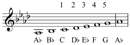 예를 들어, A♭ 메이저 온음계에서 5개의 음은 C–D♭–E♭–F–G입니다(그림 참조). 이것은 모든 종류의 스케일에 해당되지 않습니다.