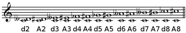 이 체계(홑음정)는 한 옥타브(12반음)까지의 음정에 적용됩니다. 더 큰 간격은 겹음정 섹션을 참조하세요.