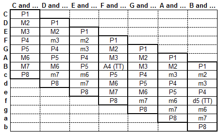 증 4도(A4)와 감 5도(d5)는 온음계에 나타나는 유일한 증음정 및 감음정입니다(표 참조).