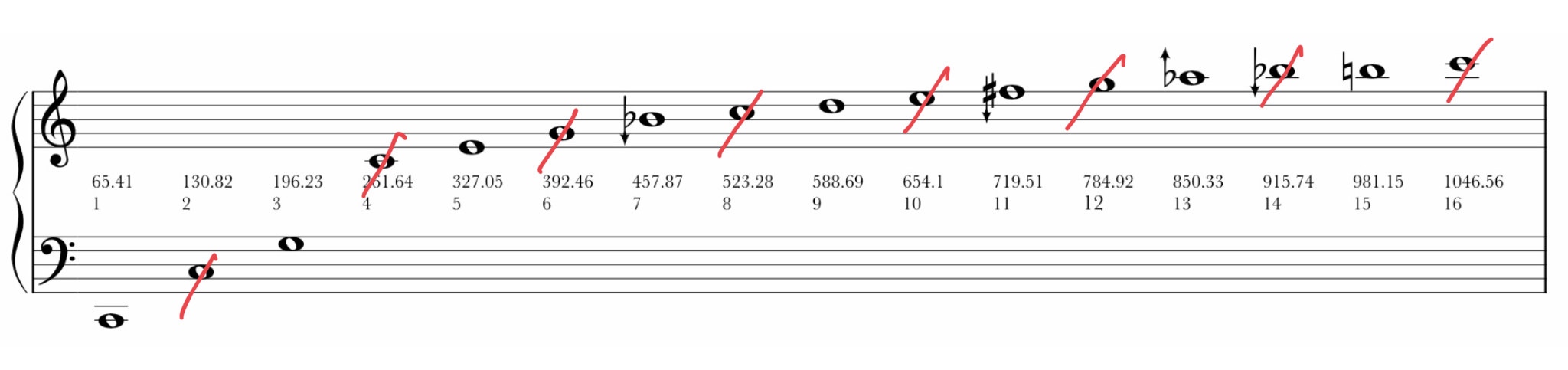 자연의 음에는 배음(overtone)이라는 현상이 있는데, 어느 한 음이 울리면 그 발음체 전체가 진동하면서 진동수의 2배, 3배, 4배 등으로 된 음들이 동시에 울리는 현상입니다. 여기서 2배, 3배, 4배로 울리는 음들을 배음이라고 합니다. 배음의 순서는 다음과 같습니다. 맨 왼쪽의 C2가 울릴 때, 그 주파수의 2배 이상이 되는 배음들이 같이 울리게 됩니다.