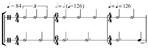 ♩ = 84 (4분음표 = 84)의 템포에서 4/4박자의 2분음표 2개가 새로운 템포의 3분음표 2개와 동일한 길이로 연주되려면 해당 템포는 다음과 같이 구합니다.
