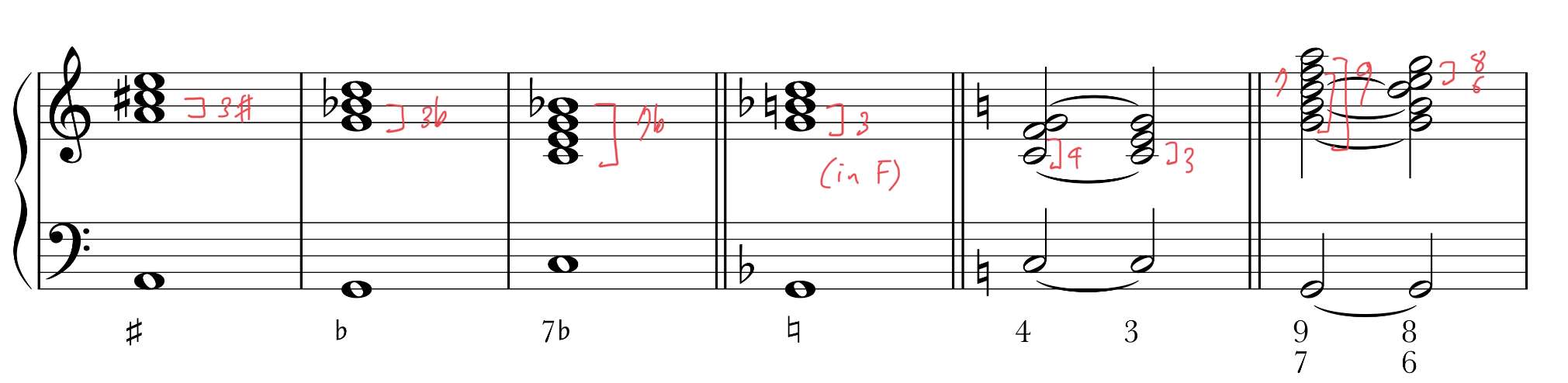 악보에 나와 있는 음들은 특별한 이유가 없다면 화음의 제일 밑음입니다. 숫자를 통해 자리바꿈이 없는지, 혹은 자리바꿈이 있는지를 판단합니다.