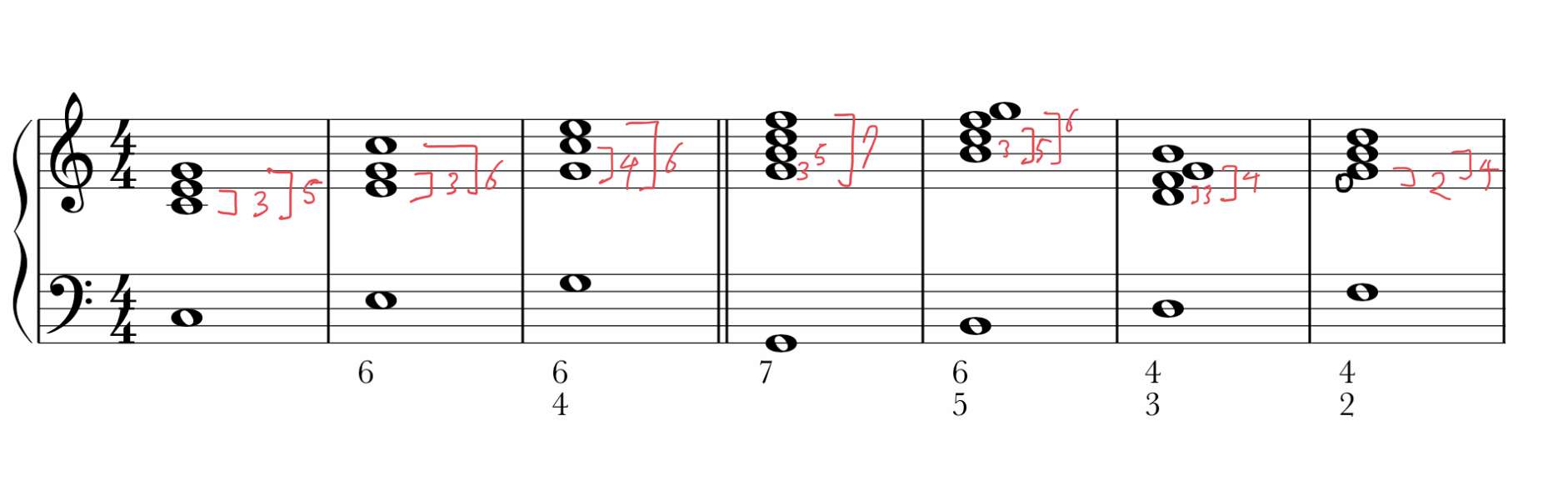 만약 숫자가 위에서부터 아래로 6, 4라면 오른손 반주 화음에서 제일 밑의 음으로부터 4도(일반적으로 완전4도) 간격의 음과 6도간격(일반적으로 장6도)의 음들이 존재하고 있음을 나타냅니다. 다른 숫자도 이런 방식으로 읽으면 되는데, 주요하게 등장하는 일반적인 숫자들은 암기하는 것이 좋을 것 같습니다.