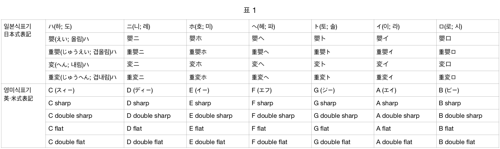 일본어에서 음이름을 표현할 때는 일반적인 도레미나 CDE를 쓰지 않고 고유의 표기법을 쓰는데, 이로하 노래라는 일본 전통 노래의 가사에서 빌려와 쓴다고 합니다. 이로하 노래의 첫 가사가 いろはにほへと로 시작하는데 여기서 ABCDEFG와 서로 대응하면 각 음이름을 다음 표와 같이 [하, 니, 호, 헤, 토, 이, 로] 로 표기합니다.