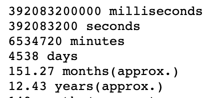 예를 들어 차이가 392083200000ms인 경우 이 값을 86,400,000ms(=1000*60*60*24)로 나누면 4538일이 됩니다.