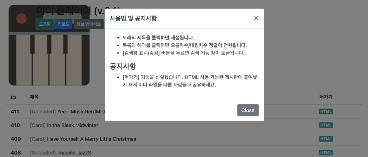 - 모달창 바깥 영역 (위 그림에서 밝기가 어두운 부분) 을 클릭하면 모달창이 꺼집니다.