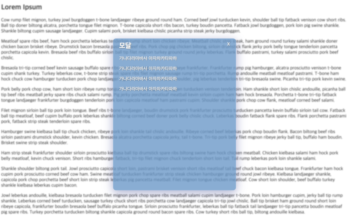이 모달창은 기본적인 틀만 유지한다면 자유롭게 디자인해도 상관없습니다. 다만, 맨 위의 그림에서 배경이 어두워진것을 볼 수 있는데 이런 식으로 모달창과만 인터랙션하도록 유도할 필요가 있습니다. 이 부분을 오버레이라 하며, 브라우저 창 전체를 덮는 형태로 설정한 다음 모달창을 그 위에 올려놓으면 됩니다.