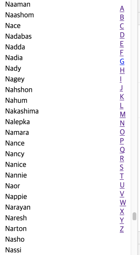 알파벳으로 구성된 내비게이터를 생성한 뒤 <a href=#아이디>로 링크된 각 문자를 클릭하면 해당 아이디를 가진 요소로 이동하는 고전적인 북마크 기능을 이용해 해당 위치로 이동하는 예제입니다.